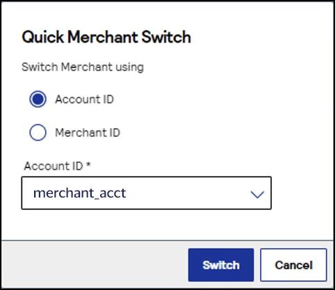The Quick Merchant Switch page appears.Choose the merchant account ID that you want to switch to, and clickSwitch.
