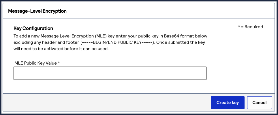 - Enter the public key value into the text field, and clickCreate Key.